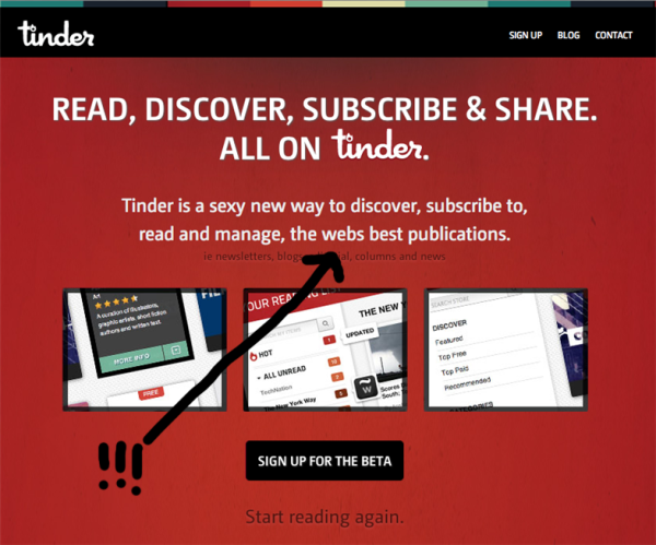 Uh, @tinder — a web service for reading high quality content — has a basic punctuation error on its front page: twitpic.com/7en6yv