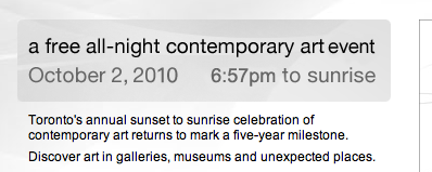 1) remember when Nuit Blanche was "A free all-night contemporary art thing" and not "event"? I preferred that: http://twitpic.com/2sjuss