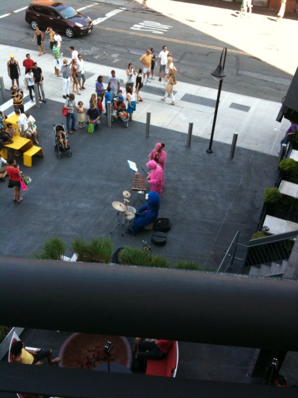 post-NYC photo: 2 pink gorillas and Cookie Monster jazz-busk under The High Line park, Sat. aft. http://twitpic.com/crki3